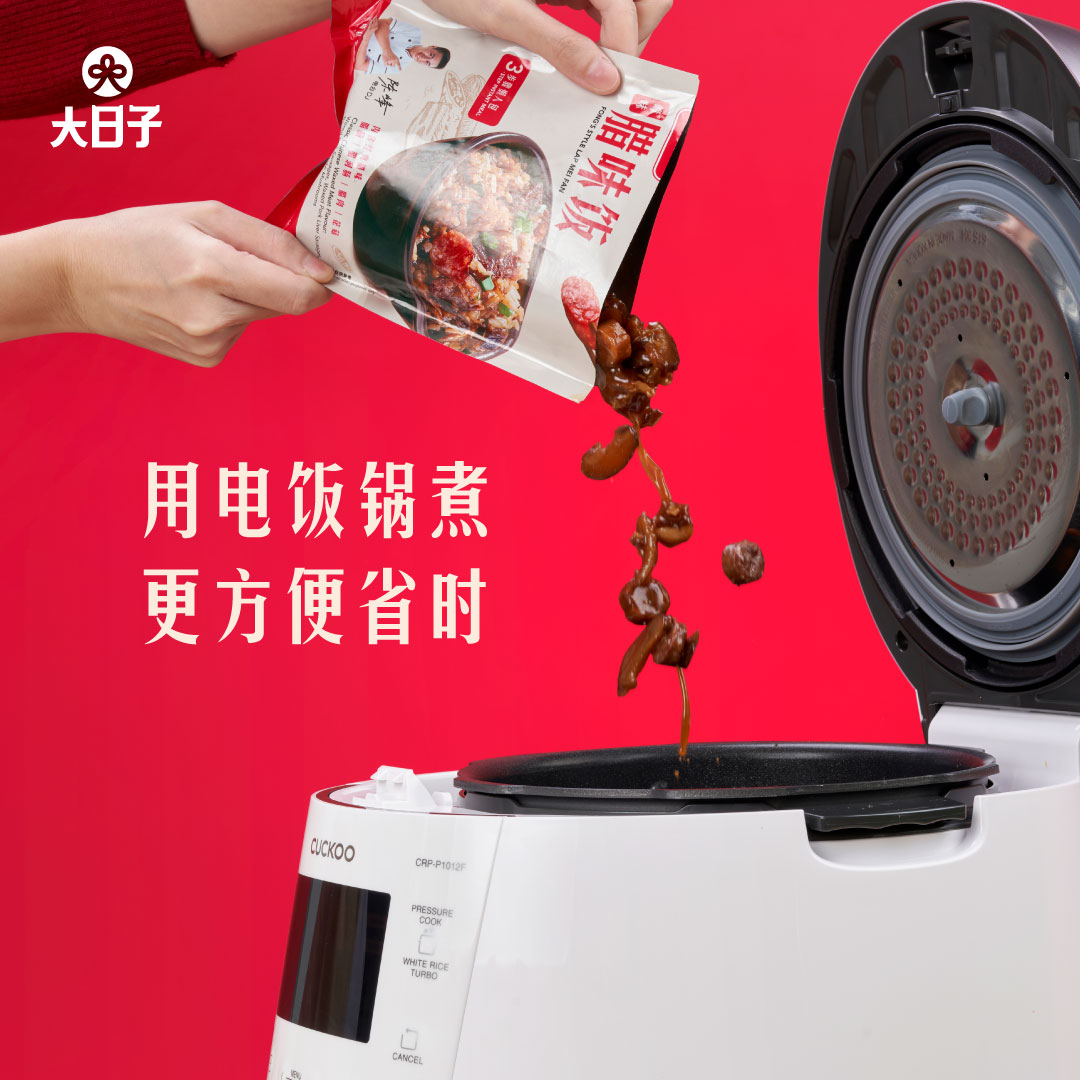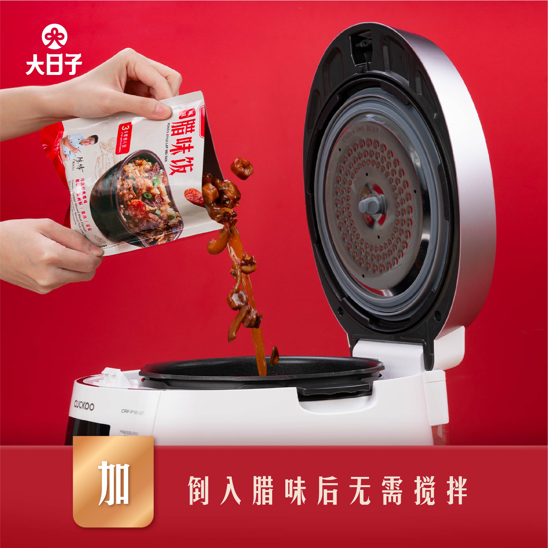 将一包 (300克) 腊味料理均匀平铺在米上。